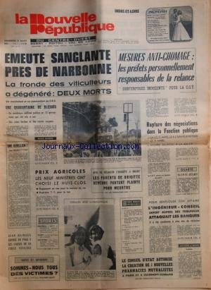 EMEUTE SANGLANTE PRES DE NARBONNE / LA FRONDE DES VITICULTEURS - UNE REBELLION PAR DUFAU - LES SPORTS - JEAN HAINAUX EXPOSE LES CAUSES DE LA CRISE VITICOLE - SOMMES-NOUS TOUS DES VICTIMES PAR SAUVY - L'ENQUETE A BRUAY / LES PARENTS DE BRITGITTE DEWEVRE PORTENT PLANTE POUR MEURTRE - RUPTURE DES NEGOCIATIONS DANS LA FONCTION PUBLIQUE