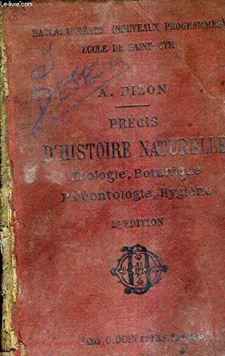 R240075732. PRECIS D'HISTOIRE NATURELLE ZOOLOGIE BOTANIQUE PALEONTOLOGIE HYGIENE A L'USAGE DES CANDIDATS AUX DIFFERENTS BACCALAUREATS ET CONFORME AUX PROGRAMMES DU 31 MAI 1902 / 2E EDITION REVUE ET CORRIGEE.. 1911. In-12. Broché. Etat d'usage, Couv. défraîchie, Dos abîmé, Intérieur acceptable. 768 pages - page de faux titre absentes - avec nombreuses figures en monochrome dont quelques unes en couleurs dans le texte - nombreuses annotations, mots soulignés au stylo ou au crayon à papier à l'intérieur de l'ouvrage sans réelle conséquence sur la lecture - coins frottés - plats tâchés - annotation sur le 1er plat - dos manquant renforcé par du papier - tranches salies.. . . . Classification Dewey : 508-Histoire naturelle