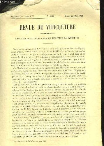 RO30075613. REVUE DE VITICULTURE - JOURNAL DE LA VITICULTURE FRANCAIS ET MONDIALE - 29° ANNEE - TOME 56 - N°1456. 25-05-1922. In-8. Broché. Etat passable, Livré sans Couverture, Dos satisfaisant, Intérieur frais. Paginé de 402 à 420. Nombreuses illustrations en noir et blanc dans le texte. Une planche illustrée en couleurs. Manque le coin supérieur gauche de l'ensemble de l'ouvrage, n'altérant pas la lecture.. . . . Classification Dewey : 634.8-Viticulture, vin
