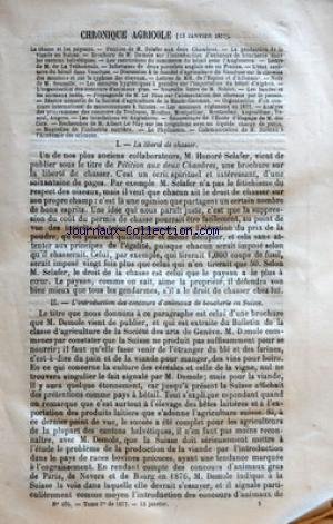 CHRONIQUE AGRICOLE - LA CHASSE ET LES PAYSANS - PETITION DE M SCLAFER AUX DEUX CHAMBRES - LA PRODUCTION DE LA VIANDE EN SUISSE - BROCHURE DE M DEMOLE SUR LÔÇÖINTRODUCTION DÔÇÖANIMAUX DE BOUCHERIE DANS LES CANTONS HELVETIQUES - LES RESTRICTIONS DU COMMERCE DU BETAIL AVEC LÔÇÖANGLETERRE - LETTRE DE M DE LA TREHONNAIS - INFORTUNES DE DEUX PORCELETS ANGLAIS NES EN FRANCE - LÔÇÖETAT SANITAIRE DU BETAIL DANS VAUCLUSE - DISCUSSION A LA SOCIETE DÔÇÖAGRICULTURE DE VAUCLUSE SUR LA CLAVELEE DES MOUTONS ET SUR LA TYPHOSE DES CHEVAUX - LETTRES DE MM DE LÔÇÖESPINE ET DÔÇÖADHEMAR - NOTE DE M SOUMILLE - LES MESURES HYGIENIQUES A PRENDRE SUR LÔÇÖIMPORTATION DU BETAIL DÔÇÖALGERIE - LÔÇÖORGANISATION DES CONCOURS DÔÇÖANIMAUX GRAS - NOUVELLE LETTRE DE M NOBLET - LES BANDES ET LES ANIMAUX ISOLES - PROPAGANDE DE M LE BIAN SUR LÔÇÖALIMENTATION DES CHEVAUX PAR LE PANAIS - SEANCE ANNUELLE DE LA SOCIETE DÔÇÖAGRICULTURE DE LA HAUTE-GARONNE - ORGANISATION DÔÇÖUNE CONCOURS INTERNATIONAL DE MOISSONNEUSES A SAINTES - LES CONCOURS REGIONAUX EN 1877 - ANALYSE DES PROGRAMMES DES CONCOURS DE TOULOUSE MOULINS MONTPELLIER MONTAUBAN ANGOULEME VESOUL ANGERS - LES INONDATIONS EN ANGLETERRE - REOUVERTURE DE LÔÇÖECOLE DÔÇÖELAGAGE DE M DES CARS - RECHERCHES DE M ALBERT LE PLAY SUR LES IRRIGATIONS AVEC UN LIQUIDE CHARGE DE PURIN - NOUVELLES DE LÔÇÖINDUSTRIE SUCRIERE - LE PHYLLOXERA - COMMUNICATION DE M BOITEAU A LÔÇÖACADEMIE DES SCIENCES - I LA LIBERTE DE CHASSER - II LÔÇÖINTRODUCTION DES CONCOURS DÔÇÖANIMAUX DE BOUCHERIE EN SUISSE - CHRONIQUE HORTICOLE