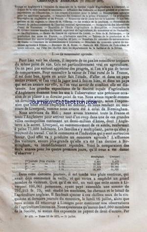 CHRONIQUE AGRICOLE - VOYAGE EN ANGLETERRE A LÔÇÖOCCASION DU CONCOURS DE LA SOCIETE ROYALE DÔÇÖAGRICULTURE A LIVERPOOL - ASPECT DE LA VILLE PENDANT LE CONCOURS - AFFLUENCE DES VISITEURS - ASPECTS GENERAL ET PREMIERES IMPRESSIONS DE LÔÇÖEXPOSITION - LES COUPES DÔÇÖHONNEUR POUR LE BETAIL - RECOMPENSES SPECIALES POUR LES MACHINES AGRICOLES - RESULTATS DES CONCOURS DE LA PRIME DÔÇÖHONNEUR - LA PRODUCTION FOURRAGERE EN ANGLETERRE ET EN FRANCE - NOUVEAUX CAS DE PESTE BOVINE A LONDRES - LES IRRIGATIONS ET LES ENGRAIS - NOTE DE M VILLEROY - LA SCIENCE ET LA PRATIQUE - FORMATION DU CONSEIL DE PERFECTIONNEMENT DE LÔÇÖINSTITUT NATIONAL AGRONOMIQUE - INAUGURATION DES LABORATOIRES DÔÇÖESSAI DE VINCENNES - NOUVELLES DE LÔÇÖECOLE DÔÇÖAGRICULTURE DE MONTPELLIER - NOMINATION DE M GRIVART COMME MEMBRE DU CONSEIL SUPERIEUR DE LÔÇÖAGRICULTURE DU COMMERCE ET DE LÔÇÖINDUSTRIE - LE PHYLLOXERA - ESSAIS DU COMITE DE VIGILANCE DU LOIRET - NOTE DE M DELIMOGES - LA PRODUCTION DES SOIES EN FRANCE - LÔÇÖINDUSTRIE SUCRIERE - TABLEAU DE LA PRODUCTION ET DU MOUVEMENT DES SUCRES INDIGENES JUSQUÔÇÖAU 30 JUIN - RESULTATS DU CONCOURS DE MOISSONNEUSES DE COZES - CONCOURS DE MOISSONNEUSES A LOUVIERS - RESULTATS DU CONCOURS SPECIAL DE MACHINES AGRICOLES A NIMES - DISCOURS DE M BOLZE - NOTES DE MM VILLIERS DE LÔÇÖISLE-ADAM ET LOUIS LEOUZON SUR LÔÇÖETAT DES RECOLTES DANS LES DEPARTEMENTS DE LA SARTHE ET DE LA DROME - I LE MOUVEMENT AGRICOLE - CONCOURS REGIONAL DE NANCY