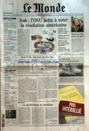 PROCES - SOCIETE GENERALE - NAOURI, TRABOULSI, SOROS FACE A LA JUSTICE FAIT DIVERS - TROIS FEMMES A LA DERIVE ET LE MEURTRE DU BOULANGER - ENQUETE PC CHINOIS - NOUVELLE GENERATION DIRIGEANTE UNION EUROPEENNE - L'HERITAGE CHRETIEN DANS LA CONSTITUTION AGRICULTURE - LA PREMIERE CRISE DU BIO BEL CANTO - DINERS LYRIQUES AU RESTAURANT DESSINS DE PRESSE - COURRIER INTERNATIONAL EXPOSE SISMOLOGIE - UNE MISSION FRANCO-TURQUE POUR SAUVER ISTANBUL MEDECINE - DES IMAGES EN TROIS DIMENSIONS POUR MIEUX SOIGNER PORTRAIT MUSIQUE - LEONHARDT, L'EXCELLENCE IRAK - L'ONU PRETE A VOTER LA RESOLUTION AMERICAINE MARINE LE PEN SELON SON PERE ETATS-UNIS - LES TAUX AU PLUS BAS VOILE - VAN DEN HEEDE, LE TOUR DU MONDE A L'ENVERS 17 EUROS D'AMENDE POUR LES FUMEURS DANS LE CENTRE DE TOKYO PAR PHILIPPE PONS ANALYSE - LE JACOBINISME EN QUESTION PAR JEAN-CLAUDE CASANOVA.