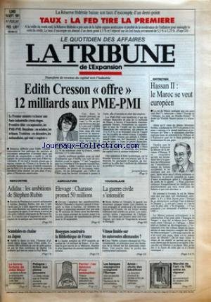 TAUX LA FED TIRE LA PREMIERE - TRANSFERTS DE REVENUS DU CAPITAL VERS L'INDUSTRIE - EDITH CRESSON OFFRE 12 MILLIARDS AUX PME-PMI PAR JACQUES JUBLIN - RENCONTRE - ADIDAS - LES AMBITIONS DE STEPHEN RUBIN - SCANDALES EN CHAINE AU JAPON - AGRICULTURE - ELEVAGE - CHARASSE PROMET 50 MILLIONS - BOUYGUES CONSTRUIRA LA BIBLIOTHEQUE DE FRANCE - YOUGOSLAVIE - LA GUERRE CIVILE S'INTENSIFIE - VITESSE LIMITEE SUR LES AUTOROUTES ALLEMANDES ? - ENTRETIEN - HASSAN II - LE MAROC SE VEUT EUROPEEN - LA BONNE FORTUNE DE JOHN MAJOR - POLOGNE - ECHEC AUX PLEINS POUVOIRS - PERRIER - LES DESSOUS D'UNE NOMINATION - LES BANQUES ESPAGNOLES CRAIGNENT L'EUROPE - AMEX - CHUTE DES BENEFICES - MARCHE DE L'ART - LA TVA ENTRE EN VIGUEUR.