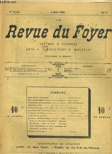 RO20130535. LA REVUE DU FOYER. LETTRES, SCIENCES, ARTS, AGRICULTURE, INDUSTRIE. 2e annee N° 27. JULES BARBEY D'AUREVILLY, L'UTILITE DE LA MALADIE, BISMARCK INTIME, LA PREMIERE PAIRE DE BOTTES.... 4 mai 1889. In-4. Broché. Bon état, Couv. convenable, Dos satisfaisant, Intérieur frais. Paginé de 418 à 432. Texte sur 3 colonnes.. . . . Classification Dewey : 70-Journalisme, édition. Journaux